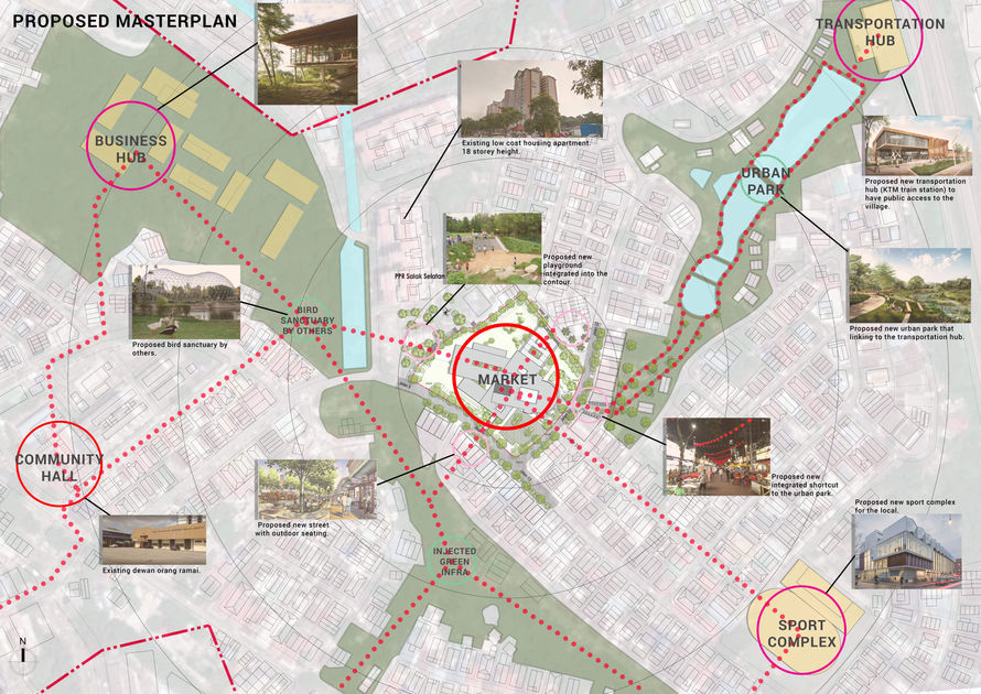 The masterplan focuses on the potential nodes and leftover green pockets. Connectivity between all these nodes and green pockets are able to rejuvenate Kg. Baru Salak Selatan into a more well connected and functioning village. Once all these connections are established with good urban infrastructure and pedestrian walkways, the connectivity within the villagers will improve. The existing wet market being the main node that connects to all these nodes. The current condition of the wet market is typical JKR wet market design. The proposal is to enhance the current condition of the wet market with a proper drop off lobby and turn each floor being walkable. Secondly, is to add one more function to the existing market. Lastly, rejuvenate the current wet market into a place where people could gather and connect.